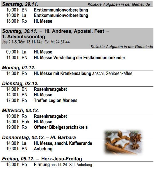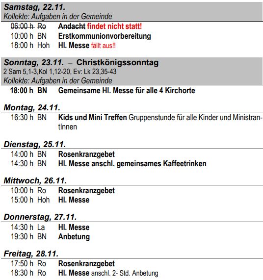 Ro: Änderung: Die für Sa, 22.11. um 6.00 Uhr fälschlicherweise im Pfarrbrief ausgewiesene Andacht in Rodenbergfindet nicht statt!