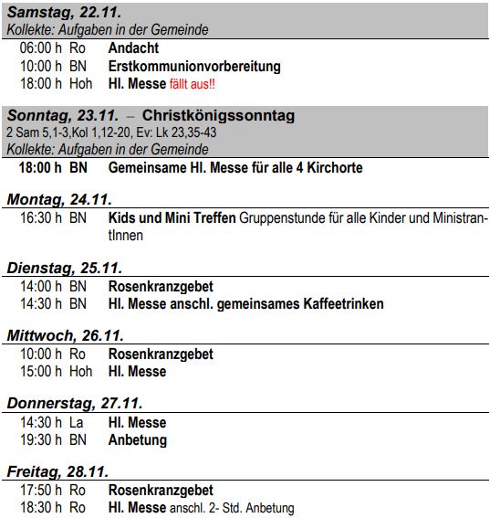Alle:Aktuell/WICHTIG: Am kommenden Wochenende, dem 22./23.11., feiern wir in der Pfarrei nur eine Hl. Messe als ABENDMESSE am So, 23.11., um 18.00 Uhr in Bad Nenndorf. Alle Interessierten sind ab 16.00 Uhr zur ==>Vorbereitung und zum Mitgestalten des Gottesdienstes eingeladen!