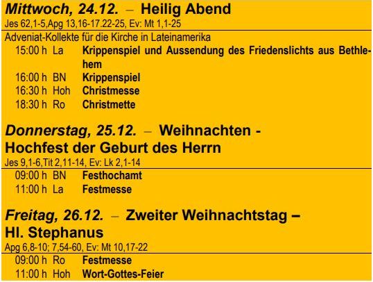 Aktuelle Informationen zur folgenden Woche: Alle: WICHTIG: Aufruf der Bischöfe zur ==>Adveniat-Kollekte zu Weihnachten und Bitte um großzügige Spenden. Alle: Aktuell/Info: Sie können sich für den Besuch der ==>STERNSINGER anmelden.