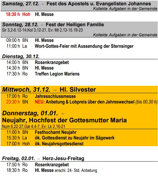 Aktuelle Informationen zur folgenden Woche: Alle: Info: Am Sa, 27.12. um 17.00 Uhr findet eine ==>Hl. Messe mit polnischen Weihnachtsliedern in Rinteln statt. Alle: Aktuell/Info: Sie können sich noch für den Besuch der ==>STERNSINGER anmelden. Alle/BN: Neuer Termin: An Silvester wird über den Jahreswechsel von 23.30 Uhr bis 0.30 Uhr Anbetung mit Lobpreis in Bad Nenndorf angeboten.