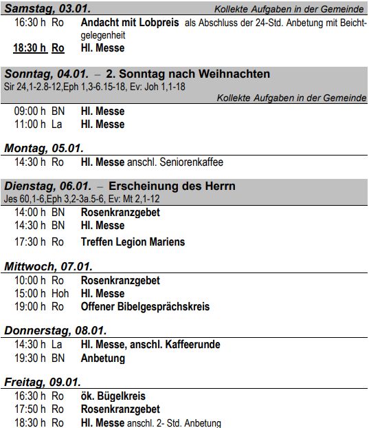 Aktuelle Informationen zur folgenden Woche: Alle: Aktuell/Info: Sie können sich noch für den Besuch der ==>STERNSINGER anmelden. Alle/BN: Neuer Termin: An Silvester wird über den Jahreswechsel von 23.30 Uhr bis 0.30 Uhr Anbetung mit Lobpreis in Bad Nenndorf angeboten.