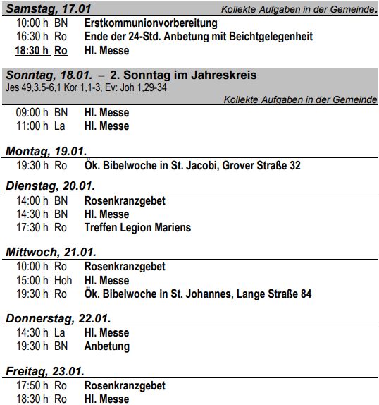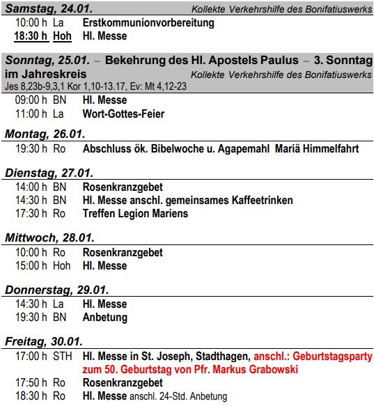Alle:NEU/Aktuell: Am Freitag, dem 30.01., wird von ==>Pfarrer Grabowski zu seinem 50. Geburtstag eingeladen, beginnend mit der Hl. Messe um 17.00 Uhr in St. Joseph, Stadthagen.
