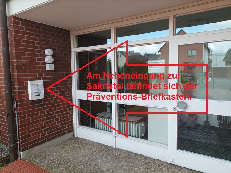 Wichtiger Bestandteil des Präventionskonzeptes ist die Möglichkeit, Hinweise und Anfragen zum Thema in einen Briefkasten zu werfen, der von einem Beauftragten regelmäßig geleert wird. Inhalte werden absolut vertraulich behandelt. Der Standort des Briefkastens ist in Hohnhorst am Nebeneingang zur Sakristei hier zu finden: