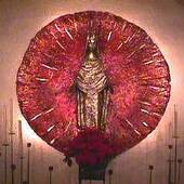 Das Altarbild der Kirche wurde von dem Bildhauer Josef Hauke, Lauenau gestaltet und am 1.2.1981 eingeweiht. Kreisförmig mit einem Durchmesser von etwa sieben Metern, in Polyester vergoldet, schmückt es die rechtwinklige Rückwand des Altarraumes und stellt das himmlische Jerusalem dar (Ich sah die heilige Stadt, das neue Jerusalem, von Gott her aus dem Himmel herabkommen, ausgestattet wie eine Braut, für ihren Gemahl geschmückt (Apk. 21,2)), – in der Mitte Christus und Maria, Christus und die Kirche, der Bräutigam und die Braut, – oben die Engel, die himmlischen Geister, – unten die Heiligen, die in der Vollendung leben. Die Mauern des himmlischen Jerusalem mit den zwölf Toren umschließen wie Feuerflammen das Geheimnis der künftigen Herrlichkeit. Das Kreuz und das Bild verbinden sich zur Aussage des Mysterium Fidei: Deinen Tod, 0 Herr, verkünden wir, und deine Auferstehung preisen wir bis du kommst in Herrlichkeit.